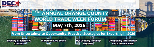 The District Export Council of Southern California (DECSC) is the recipient of the prestigious "World Trade Week Bob Kleist Leadership Award". This award is the highest recognition for an organization in international trade, and a tremendous honor for DECSC. It is in recognition of the hard work, relationships nurtured, and value created by DECSC in the trade community. The honor is awarded by the World Trade Week Los Angeles Executive Committee of the Los Angeles Chamber of Commerce.